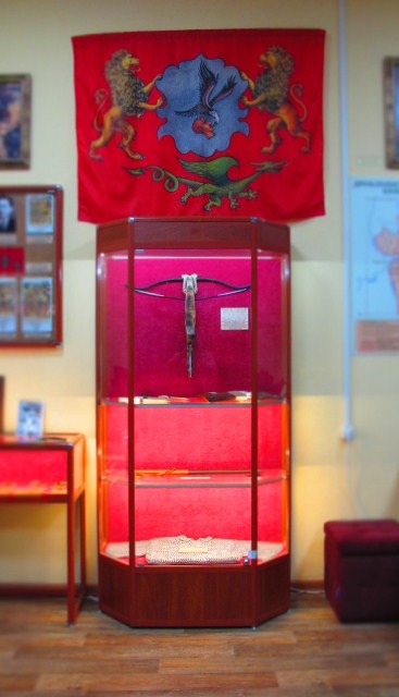 В диораме представлены реплики древнерусского боевого лука и тула — футляра в котором перевозились стрелы. А также реплики мечей, щитов, топоров и копий.