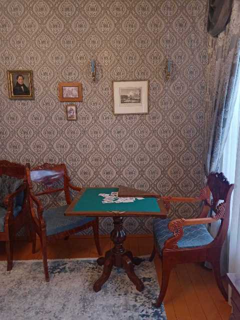 Представленные в экспозиции подлинные мебель и портреты первой половины XIX столетия дополняют документы, относящиеся к истории дворянского рода Танеевых. В частности, здесь можно ознакомиться с магистерской диссертацией Ивана Ильича Танеева по окончании словесного отделения Московского императорского университета, изданной в 1827 году, а также с монографией Сергея Васильевича Танеева «Из прошлого императорских театров. 1825-1856».