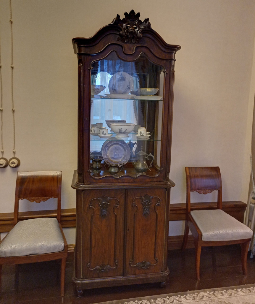 С конца XVIII века в барских усадьбах стали придавать особое значение помещениям, предназначенным для приёма пищи. В экспозиции «Дворянская столовая» посетителям предстоит познакомиться с особенностями обеда в дворянской усадьбе начала XIX века. Узнать, когда на стол выставлялись фарфоровый и серебряный сервизы, почему буфет, предназначенный для хранения посуды, называли горкой, что такое бульотка.