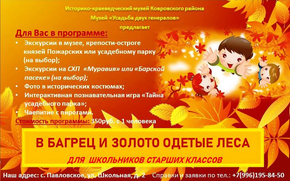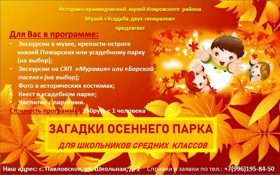 Вот и настал новый учебный год, период приобретения новых знаний, дружный класс, школьные друзья, с которыми долго не виделись. Пока царит золотая осень и солнечные теплые деньки, мы предлагаем вам провести интерактивно-познавательные часы с дружным классом на свежем воздухе в солнечном усадебном парке. программа длится около 3 часов. В каждую программу так же входит мастер класс по изготовлению сувенирной медали.