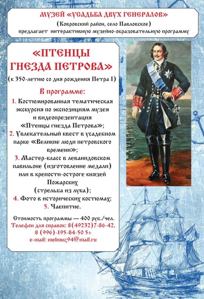 - костюмированнная тематическая экскурсия по экспозициям музея и видеопрезентация «Птенцы гнезда Петрова»;