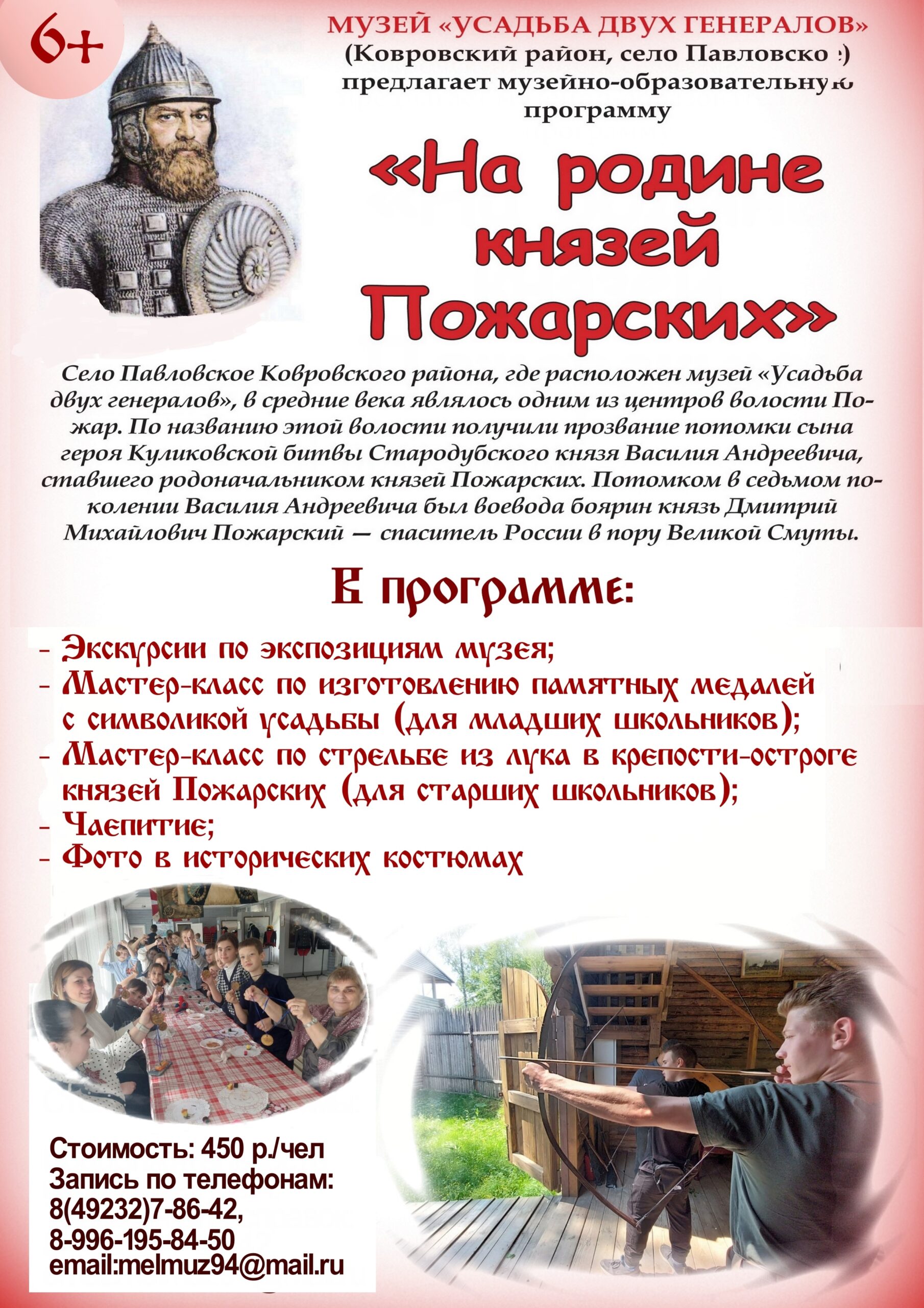 Мы приглашаем вас присоединиться к патриотической музейно-образовательной программе «На родине князей Пожарских», где вы откроете для себя удивительную историю знаменитых родов, познакомитесь с бытом и жизнью знати XVII века и ощутите связь времён.
