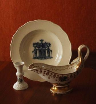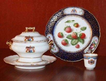 В ассортименте фарфоровых изделий мануфактуры значительная часть заказов приходилась на парадные изделия для Двора и для высокопоставленных лиц. Выпускались фарфоровые изделия и с родовыми гербами российской знати. Образцы для рисунков на фарфоре брались из «Общего гербовника дворянских родов Российской империи», который был учрежден по указу императора Павла I в 1797 году и содержит свыше трех тысяч родовых и несколько десятков личных гербов российских дворянских родов.