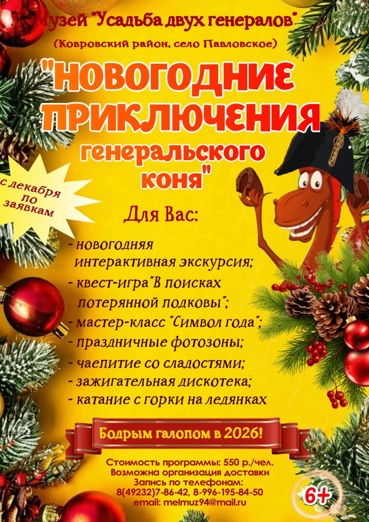 Приглашаем Вас на интерактивную музейно-образовательную программу "Новогодние приключения генеральского коня"! Для Вас: - Новогодняя интерактивная экскурсия; - Квест-игра "В поисках потерянной подковы"; - Мастер-класс "Символ года"; -Праздничные фотозоны; - Чаепитие со сладостями; -Зажигательная дискотека; - Катание с горки на ледянках Запись по телефонам: 8(49232) 7-86-42, 8-996-195-84-50