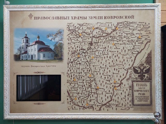 Экспозиция знакомит с историей храмов Ковровского уезда и ковровского духовенства, в том числе святителя Митрофана Воронежского, митрополита Московского и Коломенского Макария (Невского), епископа Ковровского святителя Афанасия (Сахарова), архиепископа Владимирского и Суздальского Онисима (Фестинатова). Материалы экспозиции знакомят с историй церковно-приходских школ Ковровского уезда, а также с известными церковными благотворителями.