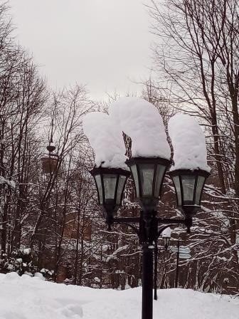 Без помощи рук человека зима буквально на всё накинула свое одеяние и убранство, как бы пряча усадебный парк от холода и мороза. Глядя на снежные шапки фонарей у танеевского родового дома, если включить чуточку фантазии, можно увидеть скоморохов, ожидающих масленицу или факелы с белым пламенем. Павлинов у солнечных часов зима решила нарядить и создать из них загадочную пару – одному одела прекрасную дамскую шляпку с накидкой, а другому приделала красивый чуб и рубашку.