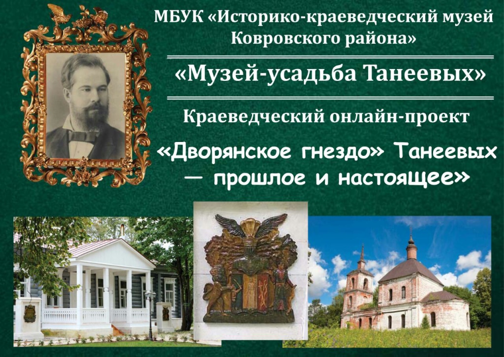 МБУК «Историко-краеведческий музей Ковровского района» «Музей-усадьба Танеевых» представляет краеведческий онлайн-проект "Дворянское гнездо" Танеевых — прошлое и настоящее" . В рамках проекта мы расскажем занимательные факты о родовом гнезде великого русского композитора, педагога Сергея Ивановича Танеева в селе Маринино Ковровского района Владимирской области, поделимся уникальными материалами и фотографиями, собранными сотрудниками музея, а также переданными в дар другими учреждениями культуры. Мы поведаем не только о славном прошлом, но и не менее славном настоящем старинной усадьбы, о событиях и праздниках, которые проходят в музейном комплексе.