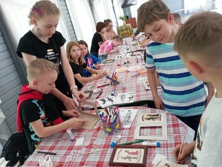 Школьники участвовали и в различных мастер-классах. У многих ребят получались красивые медали с эффектами золочения, где каждая работа автора индивидуальна и неповторима. А выполнение набойки на ткани «Офицер с дамой на балу» требовало усидчивости и кропотливой работы. Очаровательная пара в стиле XIX века у всех юных мастеров «танцевала» ярко и красочно. На других мастер-классах многие ребята научились стрелять из лука, как это делали профессиональные средневековые воины.