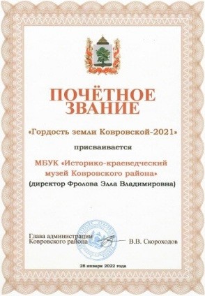 В этом году заслуженную награду получили 14 номинантов, прославивших Ковровский край своими достижениями и успехами. И среди них – муниципальное бюджетное учреждение культуры «Историко-краеведческий музей Ковровского района»! Почетное звание «Гордость земли Ковровской-2021» музей получил за успешную проектную деятельность, при этом не только в рамках Владимирского региона, но и на всероссийском уровне.