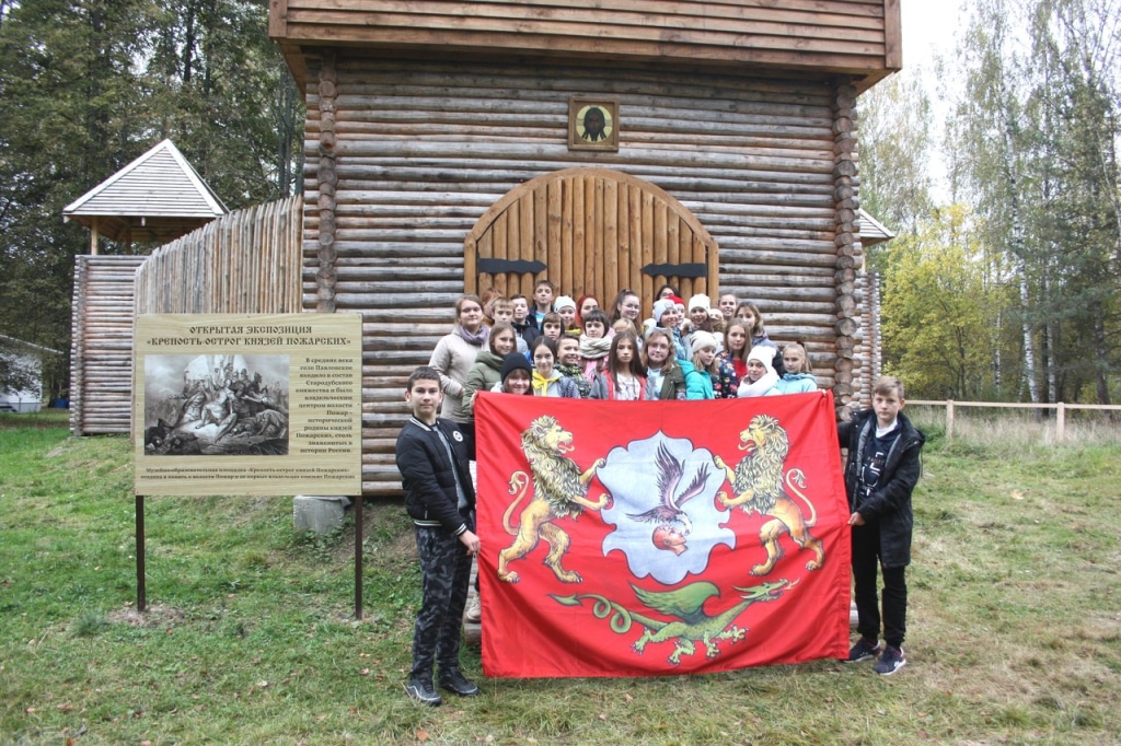 7. Группа школьников из Нижегородской области с флагом князей Пожарских у крепости в «Усадьбе двух генералов»