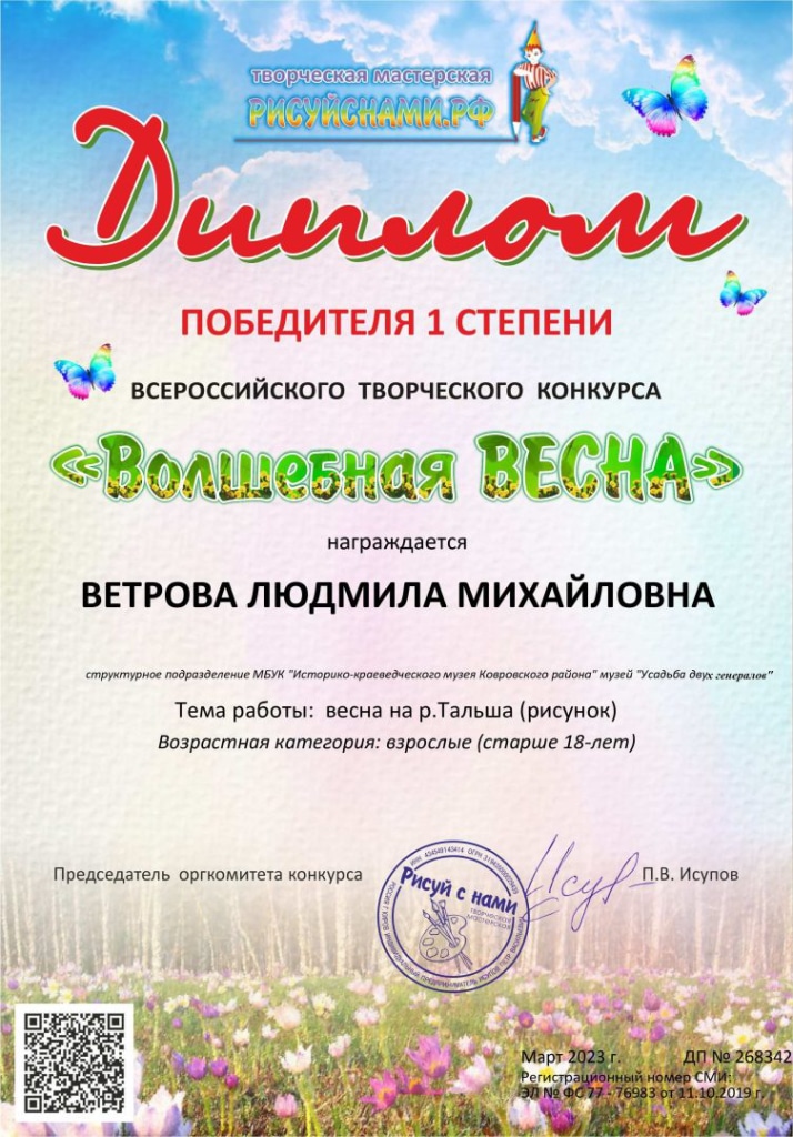 На всероссийский конкурс «Рисуй с нами» Людмила Ветрова представила работу «Весна на реке Тальша», которая приняла участие в номинации «Рисунок» (раздел «Волшебная весна») и заняла 1-е место. Этот красивый пейзаж был запечатлен автором в Камешковском районе, в родном поселке им. М. Горького. С речкой Тальша, а ее протяженность всего лишь 23 км, связано несколько исторических легенд. Легенды о Тальши складывались веками. Когда-то в средние века по ее имени называлась целая волость, а прилегающие земли входили в состав Стародубского княжества. Тальша была знаменита своими великокняжескими, а затем царскими бобровыми ловлями.