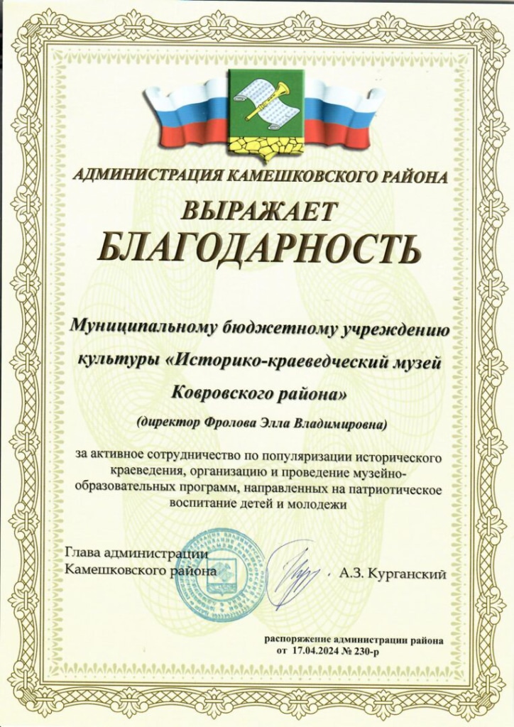 Приятно отметить, что по итогам 2023/2024 учебного года Историко-краеведческий музей Ковровского района за активное сотрудничество по популяризации исторического краеведения, организацию и проведение музейно-образовательных программ, направленных на патриотическое воспитание детей и молодежи, получил благодарность Администрации Камешковского района.