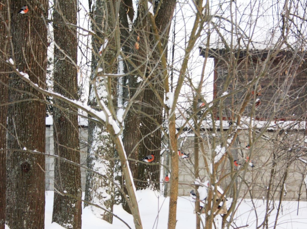 В этом году выдалась снежная зима и птицам становится всё сложнее и сложнее отыскать себе пропитание на природе и они активнее посещают кормушки, устроенные сотрудниками музея в парке. А на протяжении последней недели тут можно наблюдать необычно большое скопление этих привлекательных птиц, не менее пятнадцати пар. Мало кто знает, но только самцы снегирей имеют яркое «огненное» оперение грудки, что является их визитной карточкой. А «снегарки» - самочки снегирей имеют бледно- розовую или серую грудку. И взрослые птицы, и молодняк с удовольствие поедают семена подсолнечника, приготовленные для них сотрудниками музея, а так же местными жителями села.