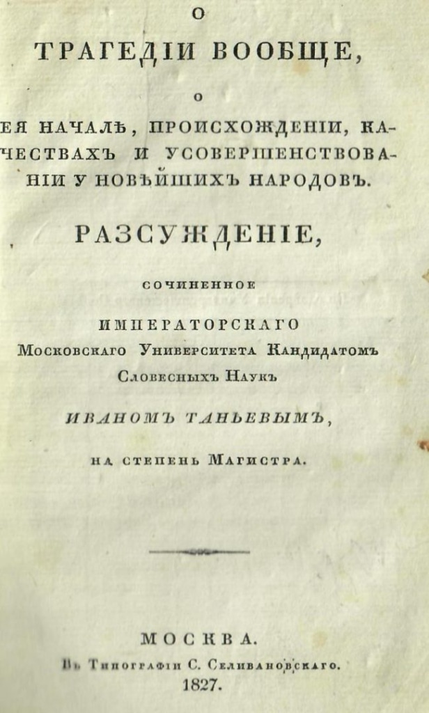 Совсем недавно Историко-краеведческому музею Ковровского района удалось приобрести уникальную книгу: "О трагедии вообще, о ея начале, происхождении, качествах и усовершенствовании у новейших народов: разсуждение, сочиненное Императорскаго Московскаго университета кандидатом словесных наук Иваном Танеевым на степень магистра". В основе данного издания — текст магистерской диссертации по филологии отца композитора, опубликованный в виде отдельной книги 195 лет назад — в 1827 году в Москве. Эта очень редкая книга, выпущенная тиражом всего лишь в несколько десятков экземпляров. Сколько из этих экземпляров дошло до наших дней — вопрос риторический, но надо полагать, что очень немного. Во Владимирской области прежде ее не имелось. По существующим критериям данное издание является книжным памятником — к их числу относятся книги, изданные до 1830 года.