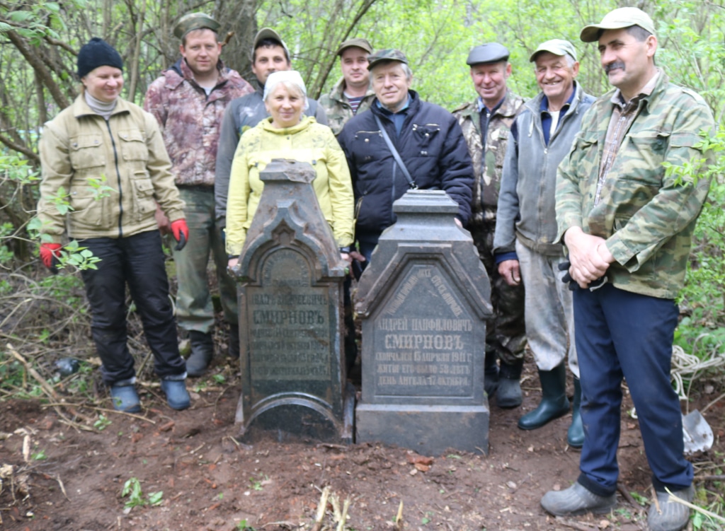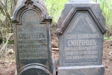 Два других массивных гранитных надгробия, которые были повалены и почти скрыты землей и мусором, оказались памятниками церковного старосты Никольского храма погоста Дебри Андрея Панфиловича Смирнова, богатого лесопромышленника, жившего в местном приходе, родом из Подмосковья, и его сына Ивана Андреевича Смирнова. А. П. Смирнов занимал должность церковного старосты в Дебрях более двух десятков лет вплоть до своей кончины в 1911 году в 58-летнем возрасте и много сделал для ремонта и благоустройства Никольского храма. Похоронили его на почетном месте за церковным алтарем. В 1930-е годы семейный склеп Смирновых был разорен. Рядом с церковным старостой находилось погребение его сына Ивана Андреевича Смирнова, умершего прежде отца в 1903 году совсем молодым (ему было всего 24). Ранее о существование этих памятников было неизвестно, так как много исторических надгробий погоста оказалось утрачено. Теперь гранитные памятники отцу и сыну Смирновым, кстати, изготовленные в Москве (сохранились соответствующие клейма) и привезенные оттуда в лесной погост установлены примерно на том месте, где находились прежде. Поставить в вертикальное положение такие тяжелые конструкции стоило немалых трудов, но местные энтузиасты выполнили такую работу почти играючи!