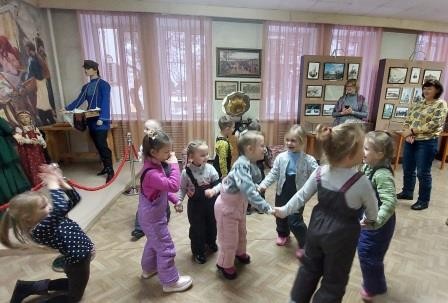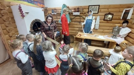 В русской избе, представленной в экспозиции, происходит событие – приход офени в крестьянскую семью. 5-6-летним гостям музея на историческом материале рассказали, кто такие офени и чем они занимались. Закончилась экскурсия под музыку веселого романса на слова Н.А. Некрасова «Эх, полным-полна коробушка», посвященного офеням-коробейникам, который прозвучал из ретро-граммофона. Под музыку романса малыши лихо пустились в пляс! Знакомство с музеем Ковровского района состоялось!
