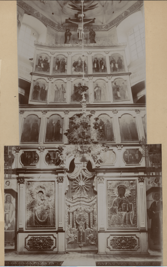 Уникальна фотография высокого пятиярусного иконостаса Никольской церкви, датируемая маем 1910-го. Если церковные стены по большей части уцелели, то от иконостаса, изготовленного, скорее всего, в 1760-е гг., нынче не осталось и следа. Между тем фотоснимок высочайшего качества передает множество даже совсем мелких деталей: подписи на образах византийского письма, элементы декора богато украшенных царских врат и всего иконостаса, чеканные оклады икон, попавшие в кадр праздничные металлические хоругви, огромное роскошное паникадило, а также массивное резное распятие (прекрасный образец деревянной скульптуры), венчающее многоярусную конструкцию.