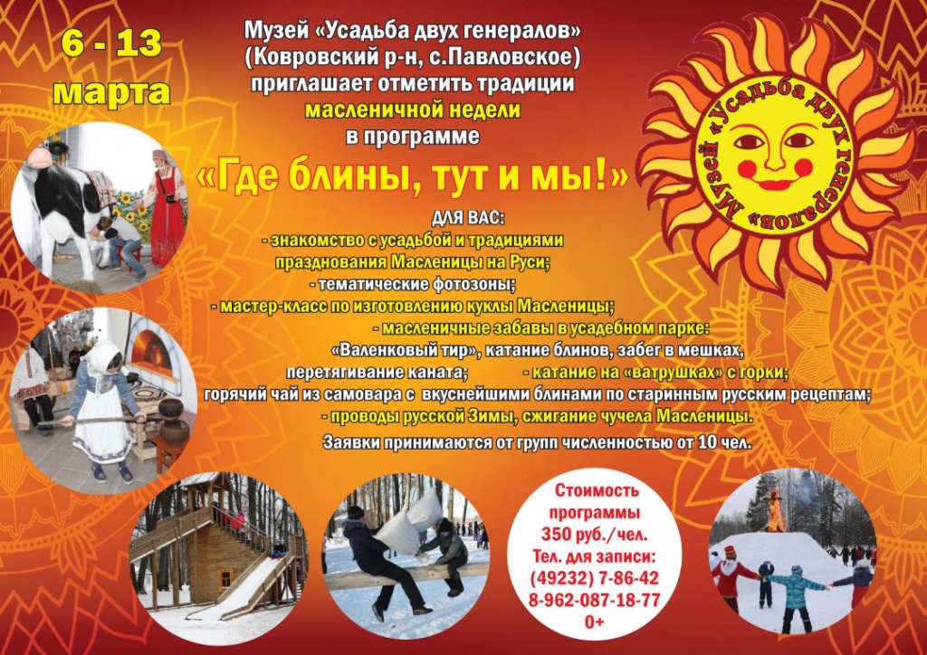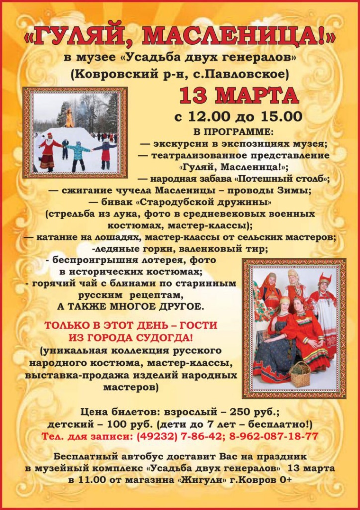 Мы ждем Вас на Масленичной неделе, и вы получите массу ярких впечатлений и хорошего настроения. Дополнительная информация и заявки по телефону: 8(49232) 7-86-42; 8-962-087-18-77