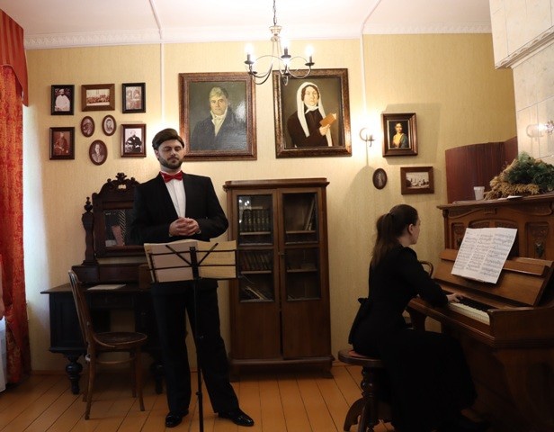 А лауреат международных и всероссийских конкурсов известный ковровский вокалист Иван Колтыгин и аккомпаниатор Людмила Рустамова подарили участникам вернисажа исполнение классических романсов и фрагментов оперных арий на стихи великого Пушкина.