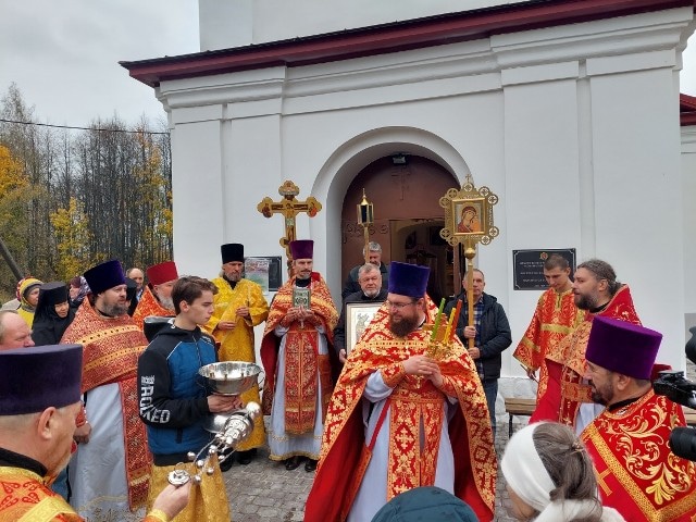 В храме прошло праздничное богослужение, состоялся крестный ход вокруг возрожденной церкви.